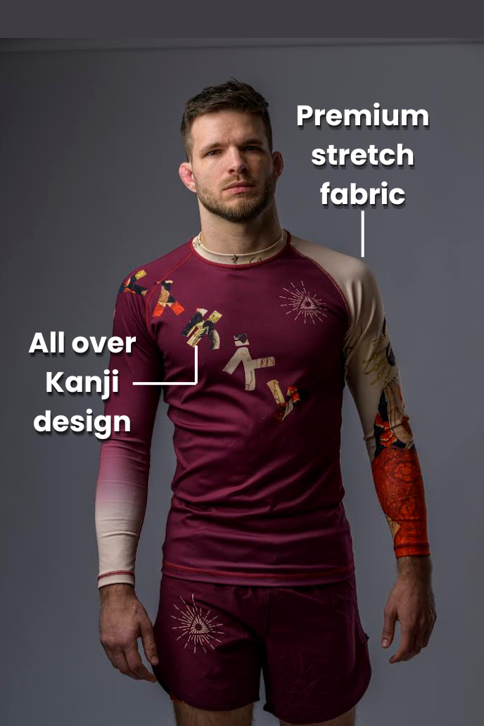 'Stoïcisme'; het doorstaan van pijn of ontbering zonder uiting van gevoelens en zonder klagen. Dit woord wordt in Kanji over de borst weergegeven, uitgesneden in de print van het ontwerp. De shorts in onze Akai set volgen onze populaire 'Hybride' stijl: een dunne buitenlaag voor veilig trainen en sparren, met compressieshorts erin verweven voorzien van zakken voor extra gemak.