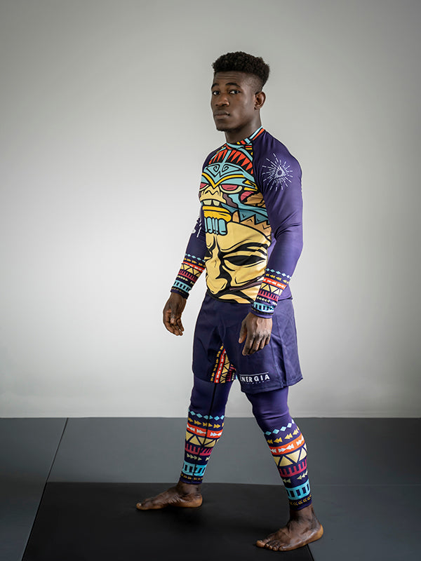 These vibrant and colorful designs are guaranteed to catch attention on the mat or in the gym! Deep purple with graceful South American decorations.