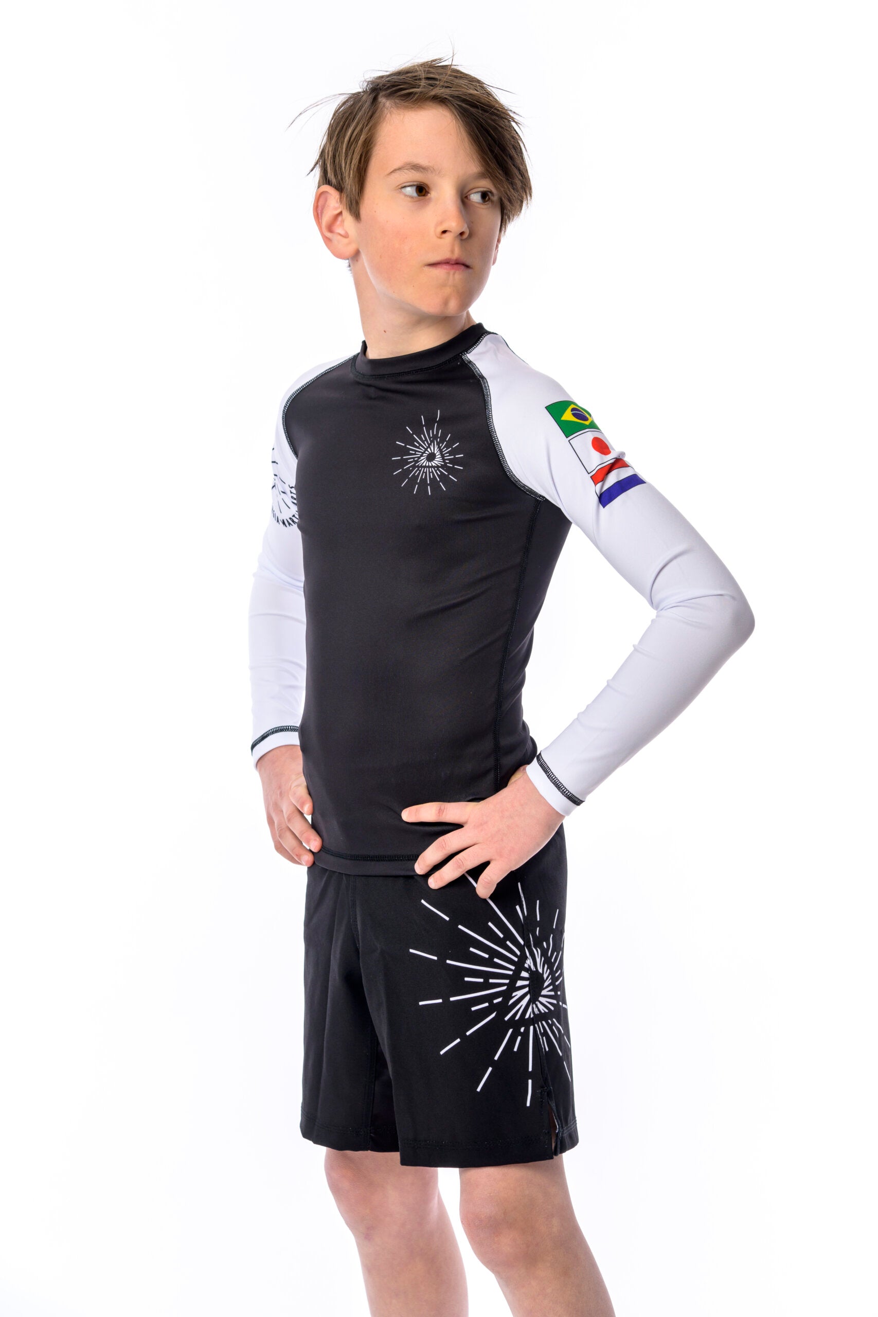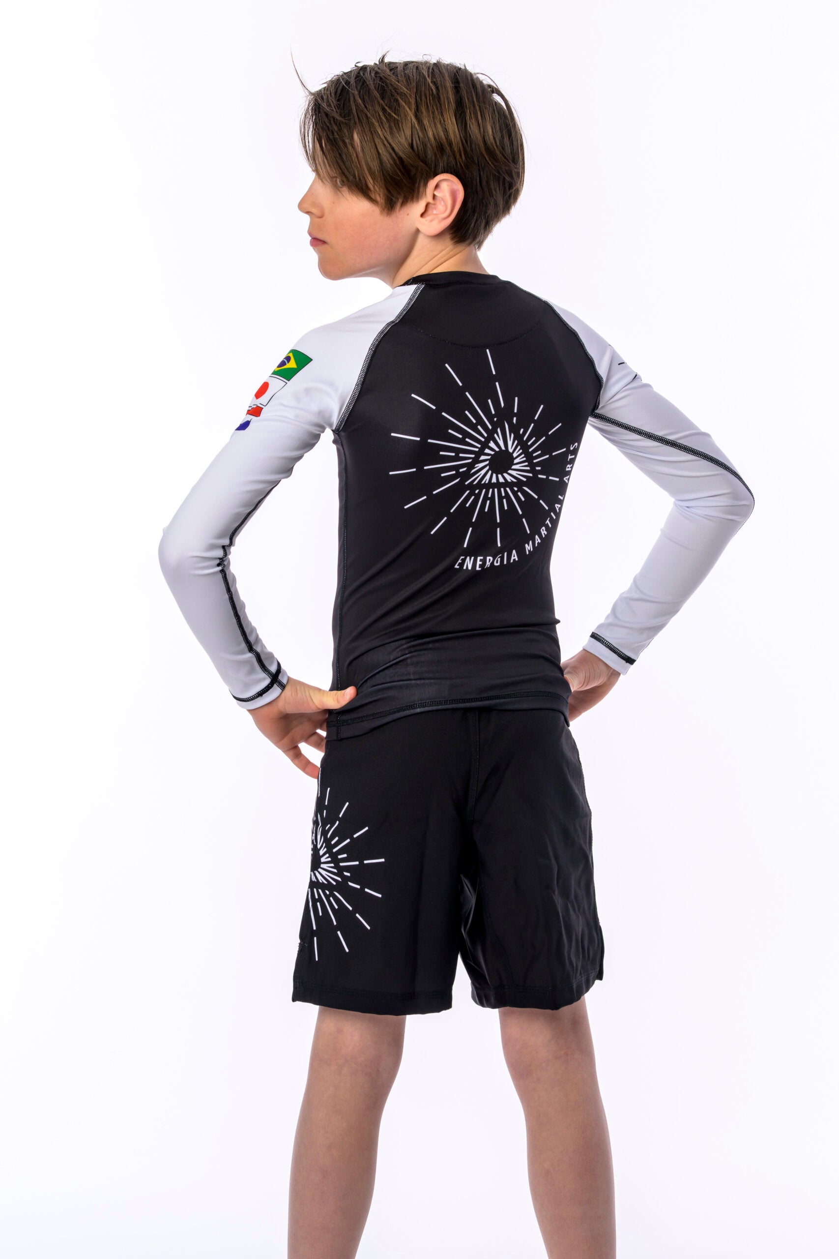 The Energia Martial Arts no-gi uniform includes our long-sleeve V1 rashguard and black V1 shorts with both elastic waistband and drawstring.