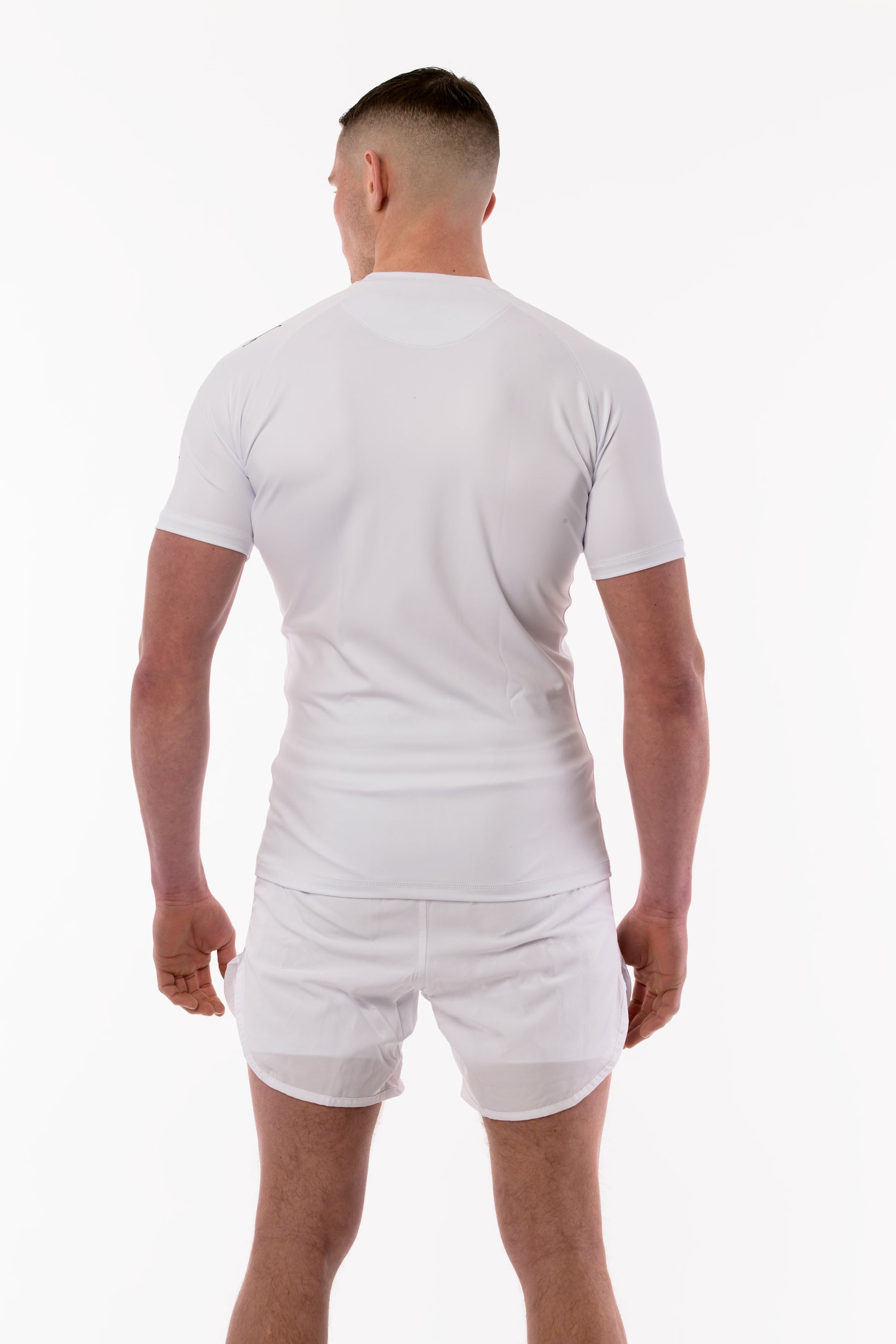 Featuring a pure white design with a sleek logo on the chest and shoulder, perfect for the true minimalist.